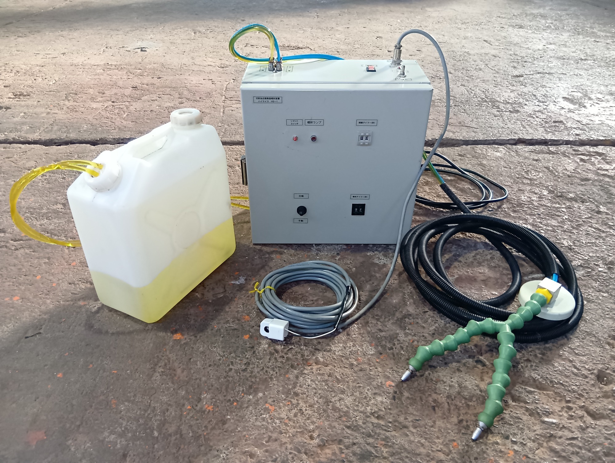 | 仕様 | ・切削油の噴射間隔、噴射時間を自由に設定可能 ・フレキシブルノズルで、噴射角度を自由に変更可能 ・磁石付きノズルで、ワンタッチで取付け可能 ・コンプレッサ内蔵で、一次側エアホース不要 |